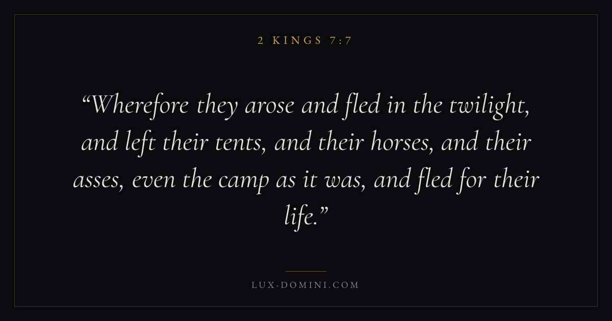 Wherefore they arose and fled in the twilight, and left their tents, and their horses, and their asses, even the camp as it was, and fled for their life.