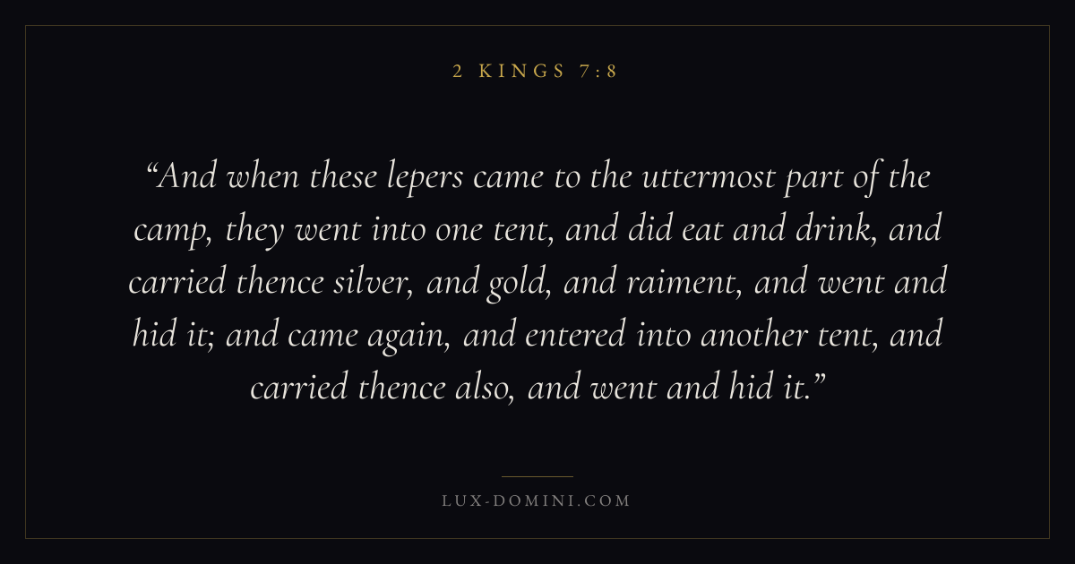 And when these lepers came to the uttermost part of the camp, they went into one tent, and did eat and drink, and carried thence silver, and gold, and raiment, and went and hid it; and came again, and entered into another tent, and carried thence also, and went and hid it.