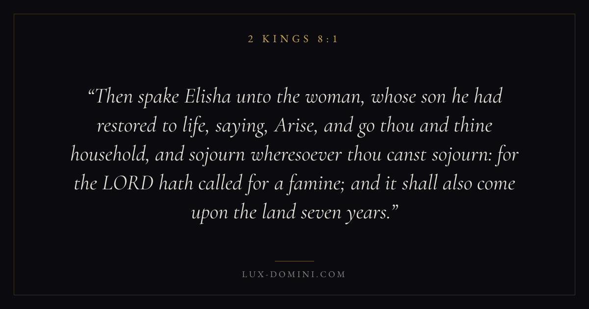 Then spake Elisha unto the woman, whose son he had restored to life, saying, Arise, and go thou and thine household, and sojourn wheresoever thou canst sojourn: for the LORD hath called for a famine; and it shall also come upon the land seven years.