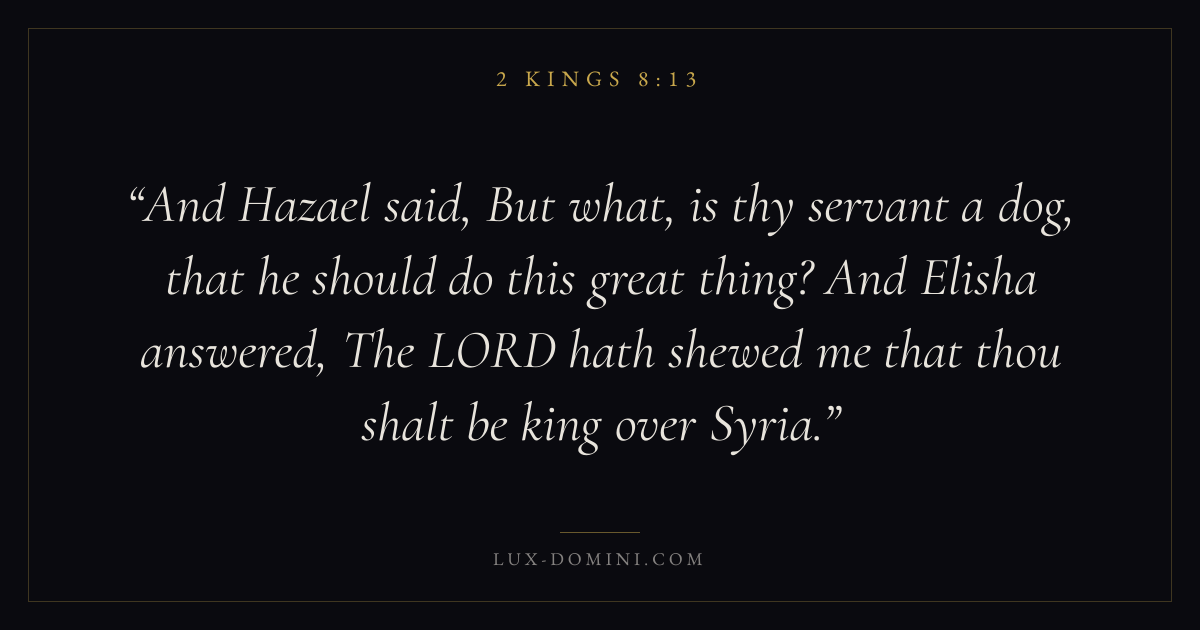 And Hazael said, But what, is thy servant a dog, that he should do this great thing? And Elisha answered, The LORD hath shewed me that thou shalt be king over Syria.