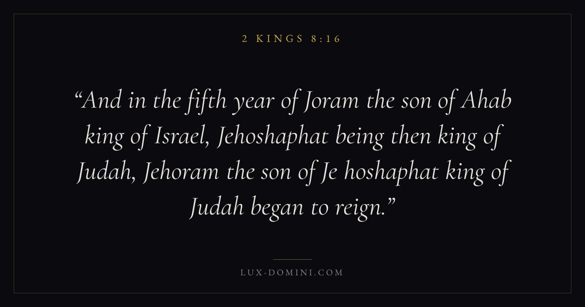 And in the fifth year of Joram the son of Ahab king of Israel, Jehoshaphat being then king of Judah, Jehoram the son of Je hoshaphat king of Judah began to reign.