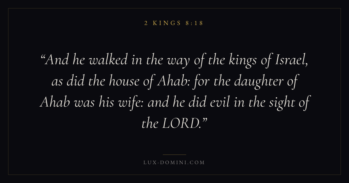And he walked in the way of the kings of Israel, as did the house of Ahab: for the daughter of Ahab was his wife: and he did evil in the sight of the LORD.