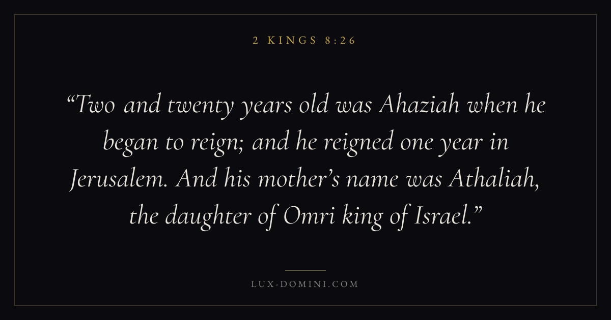 Two and twenty years old was Ahaziah when he began to reign; and he reigned one year in Jerusalem. And his mother’s name was Athaliah, the daughter of Omri king of Israel.