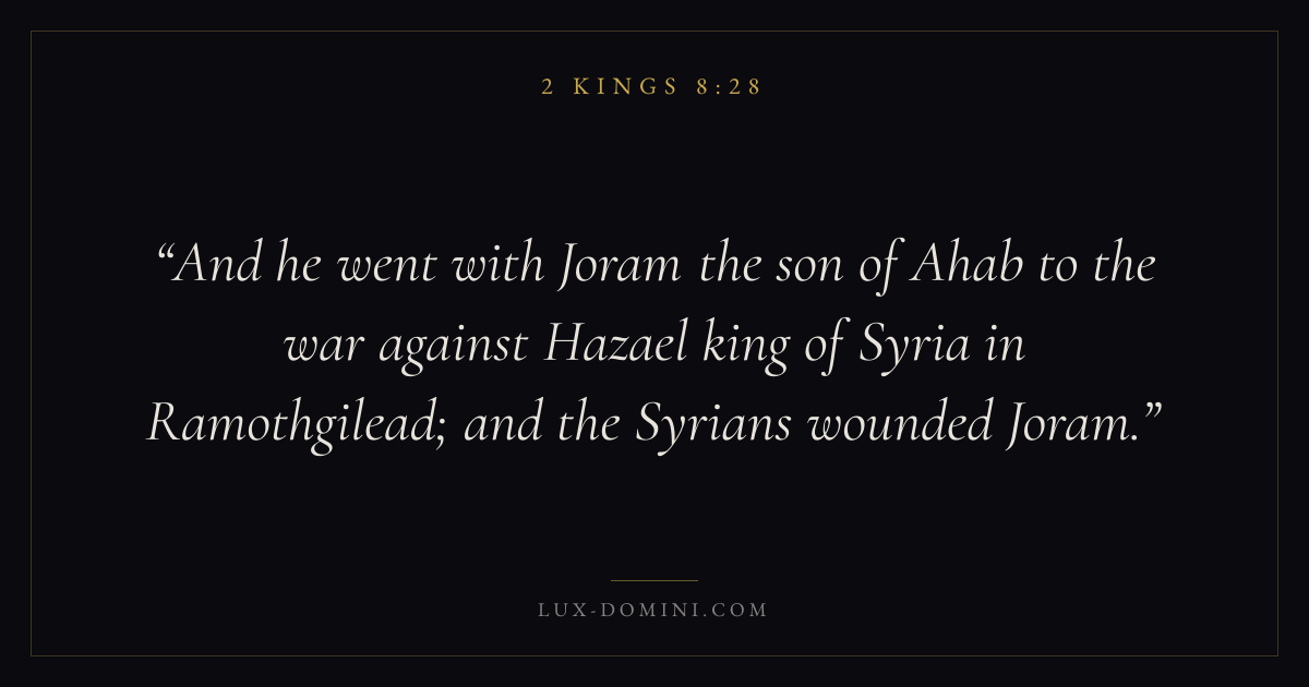And he went with Joram the son of Ahab to the war against Hazael king of Syria in Ramothgilead; and the Syrians wounded Joram.