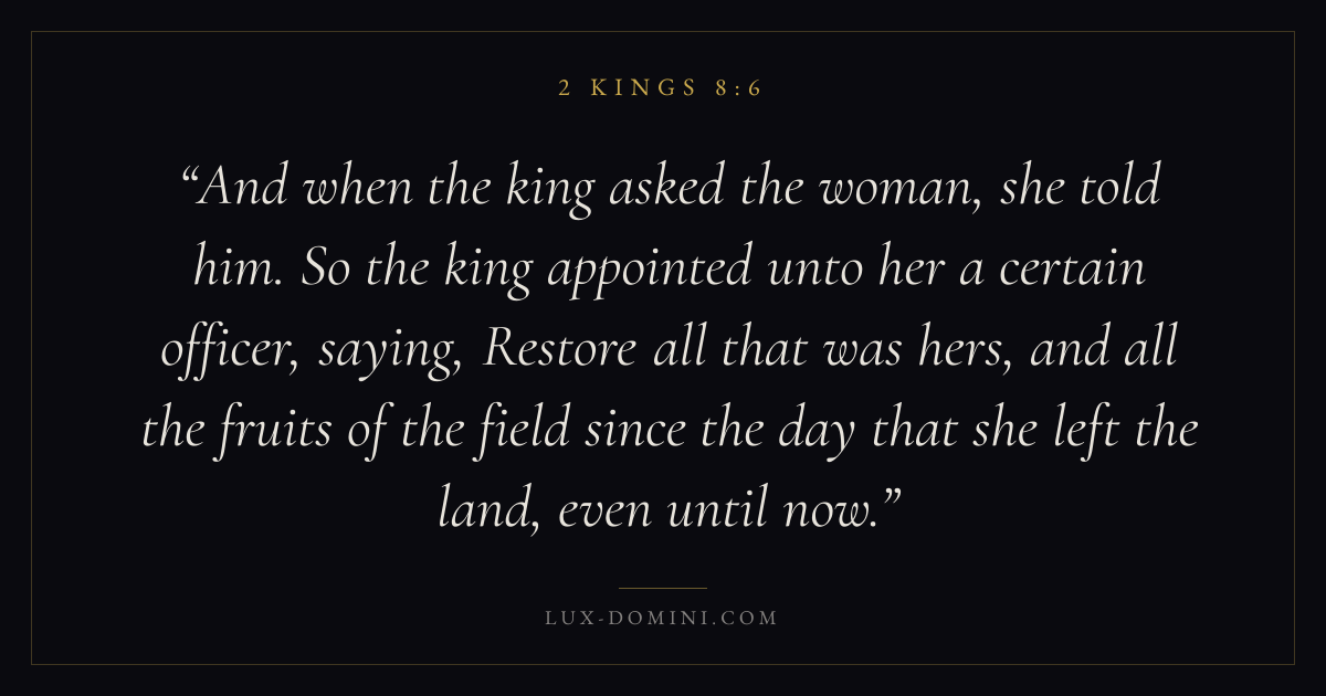 And when the king asked the woman, she told him. So the king appointed unto her a certain officer, saying, Restore all that was hers, and all the fruits of the field since the day that she left the land, even until now.