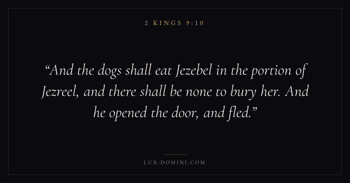 And the dogs shall eat Jezebel in the portion of Jezreel, and there shall be none to bury her. And he opened the door, and fled.