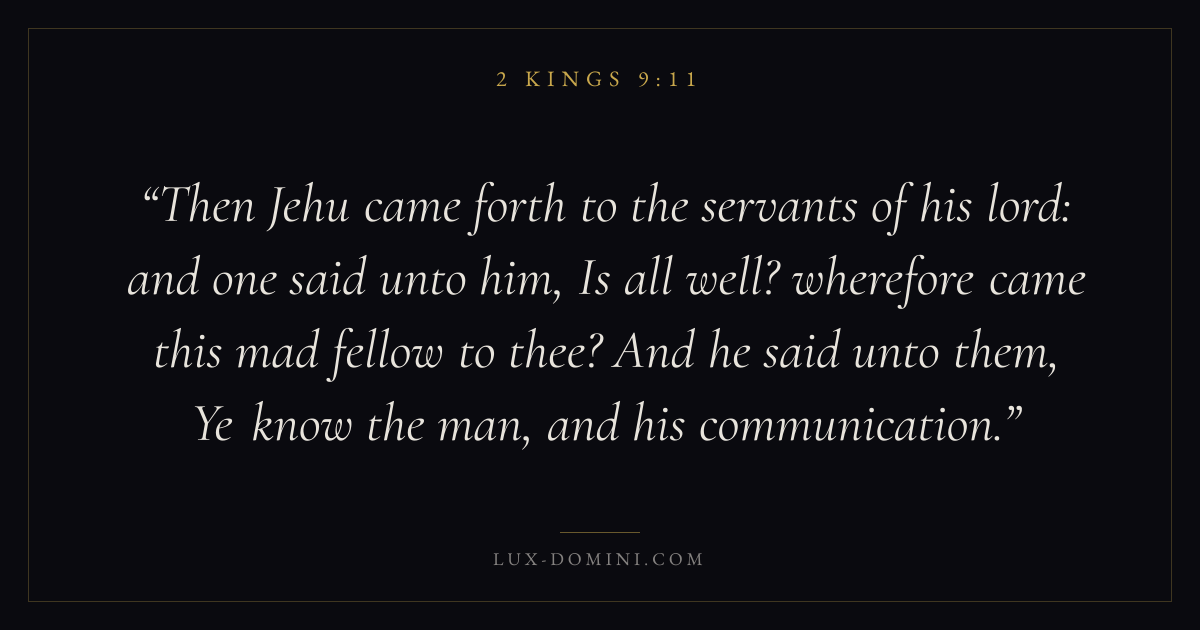 Then Jehu came forth to the servants of his lord: and one said unto him, Is all well? wherefore came this mad fellow to thee? And he said unto them, Ye know the man, and his communication.