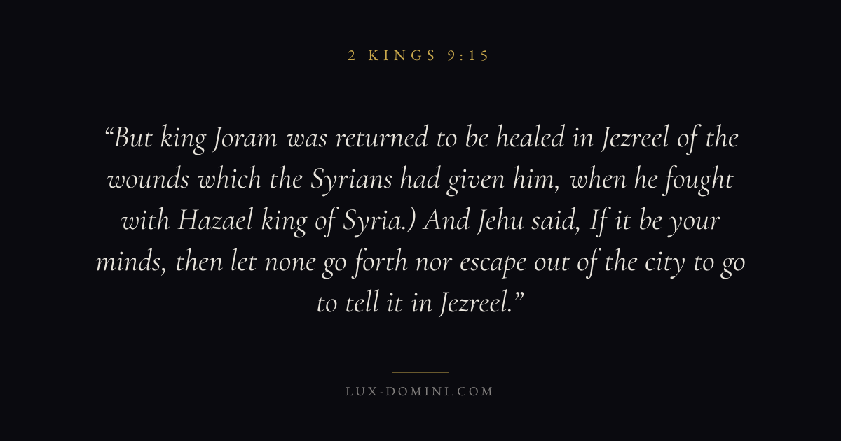But king Joram was returned to be healed in Jezreel of the wounds which the Syrians had given him, when he fought with Hazael king of Syria.) And Jehu said, If it be your minds, then let none go forth nor escape out of the city to go to tell it in Jezreel.