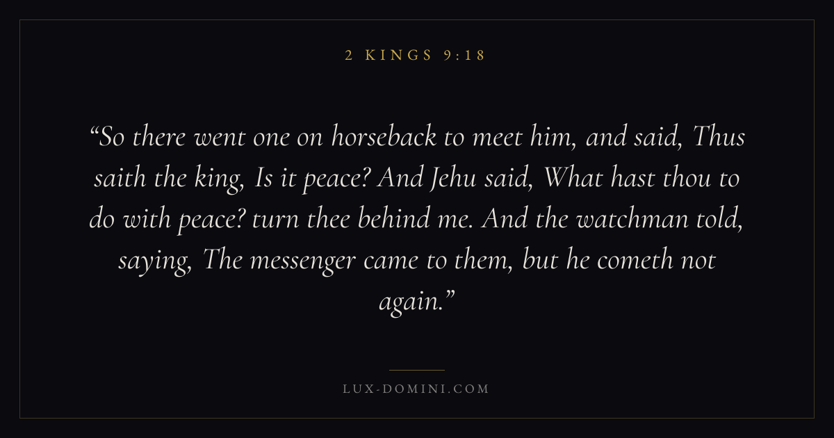 So there went one on horseback to meet him, and said, Thus saith the king, Is it peace? And Jehu said, What hast thou to do with peace? turn thee behind me. And the watchman told, saying, The messenger came to them, but he cometh not again.
