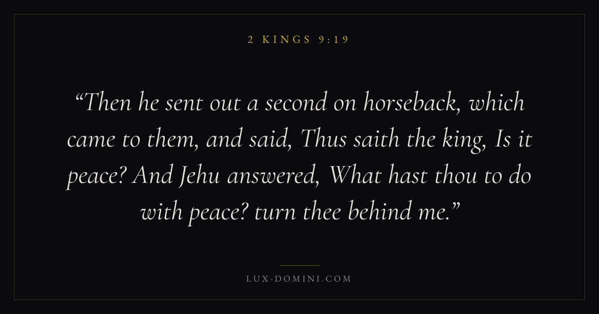 Then he sent out a second on horseback, which came to them, and said, Thus saith the king, Is it peace? And Jehu answered, What hast thou to do with peace? turn thee behind me.