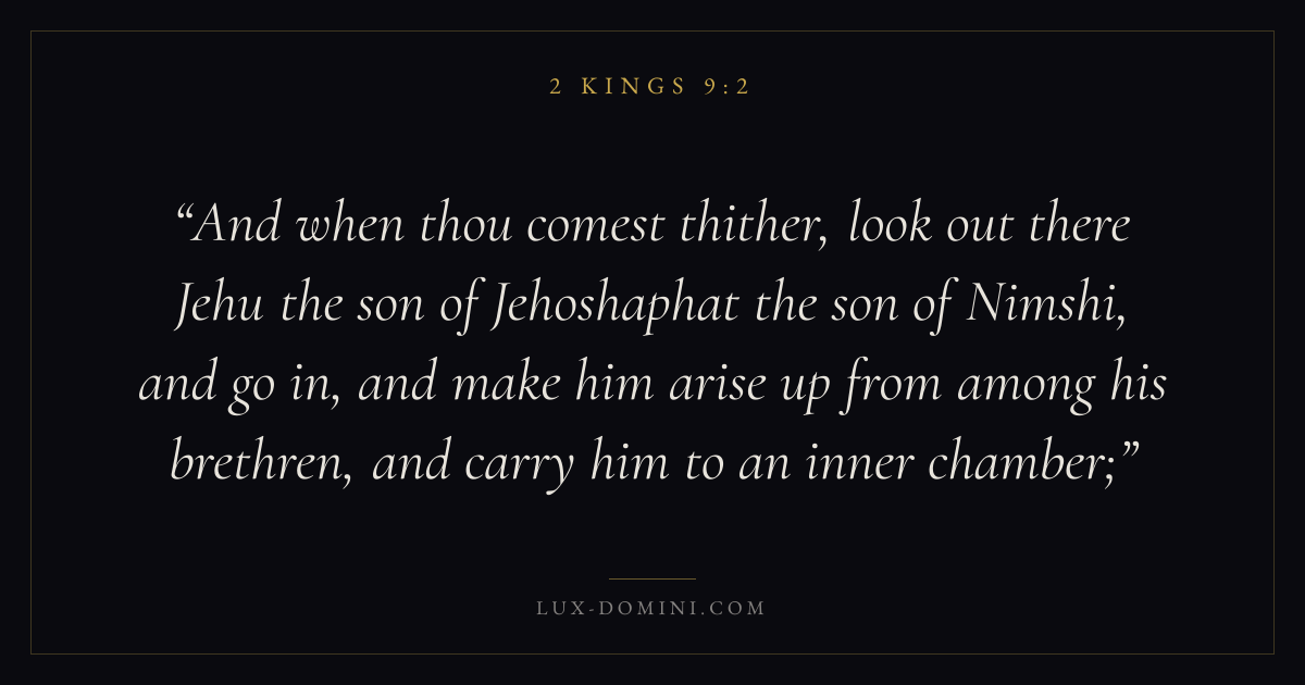 And when thou comest thither, look out there Jehu the son of Jehoshaphat the son of Nimshi, and go in, and make him arise up from among his brethren, and carry him to an inner chamber;