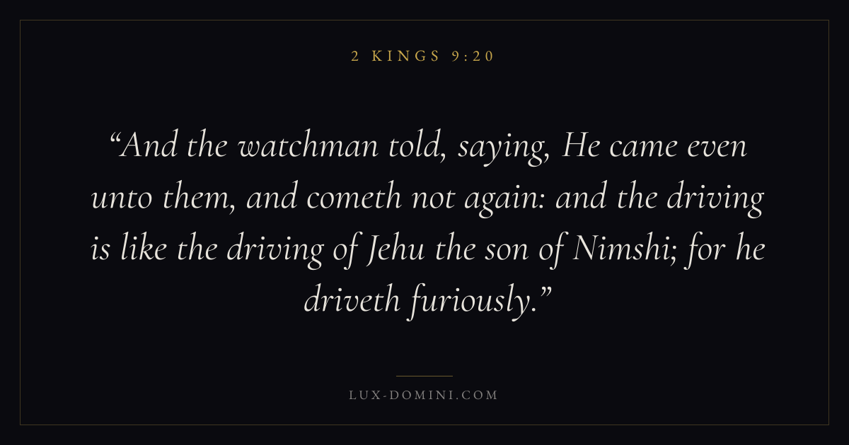 And the watchman told, saying, He came even unto them, and cometh not again: and the driving is like the driving of Jehu the son of Nimshi; for he driveth furiously.
