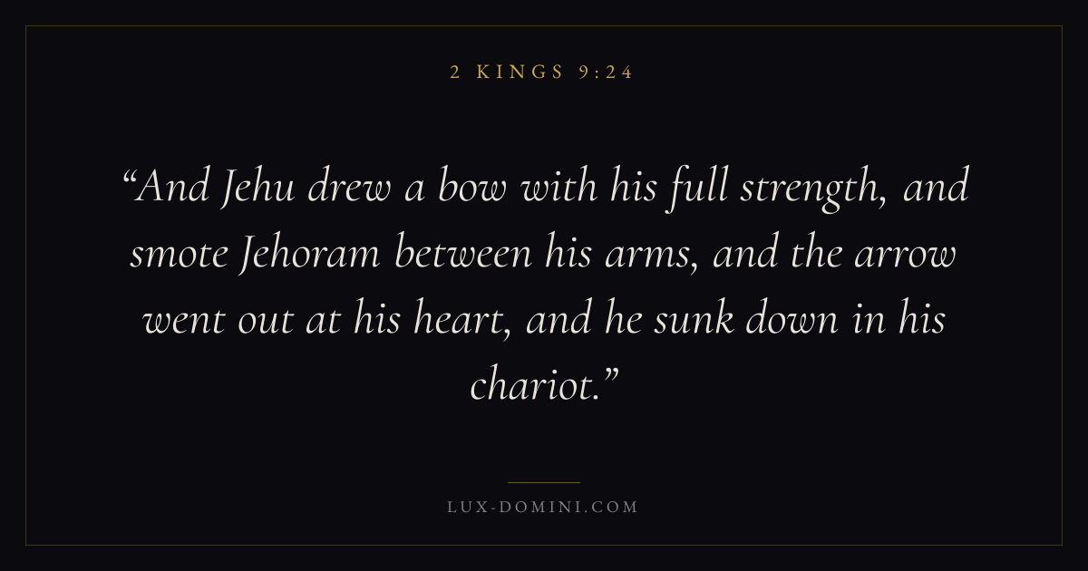 And Jehu drew a bow with his full strength, and smote Jehoram between his arms, and the arrow went out at his heart, and he sunk down in his chariot.