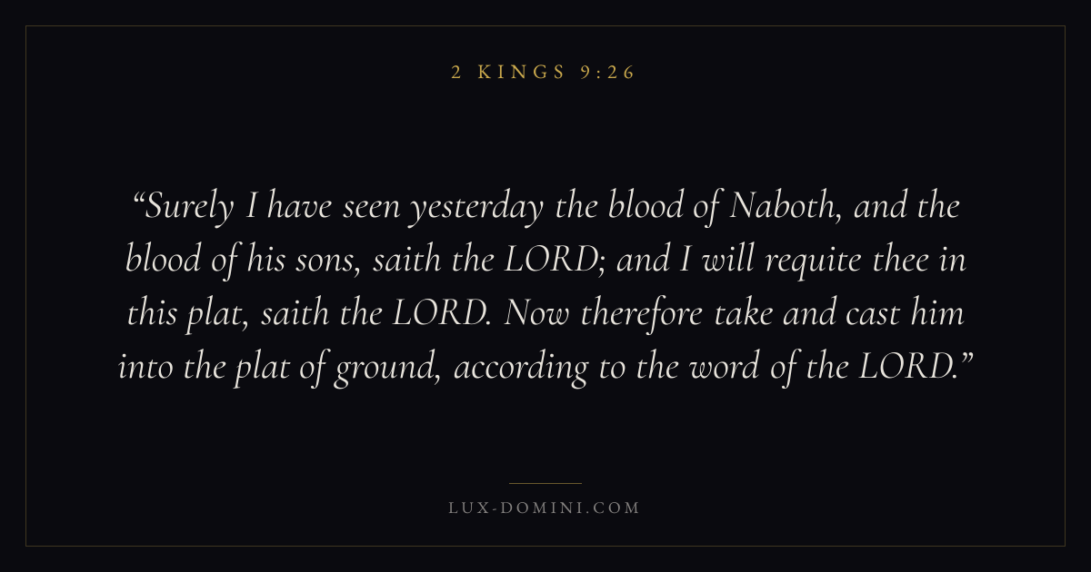 Surely I have seen yesterday the blood of Naboth, and the blood of his sons, saith the LORD; and I will requite thee in this plat, saith the LORD. Now therefore take and cast him into the plat of ground, according to the word of the LORD.