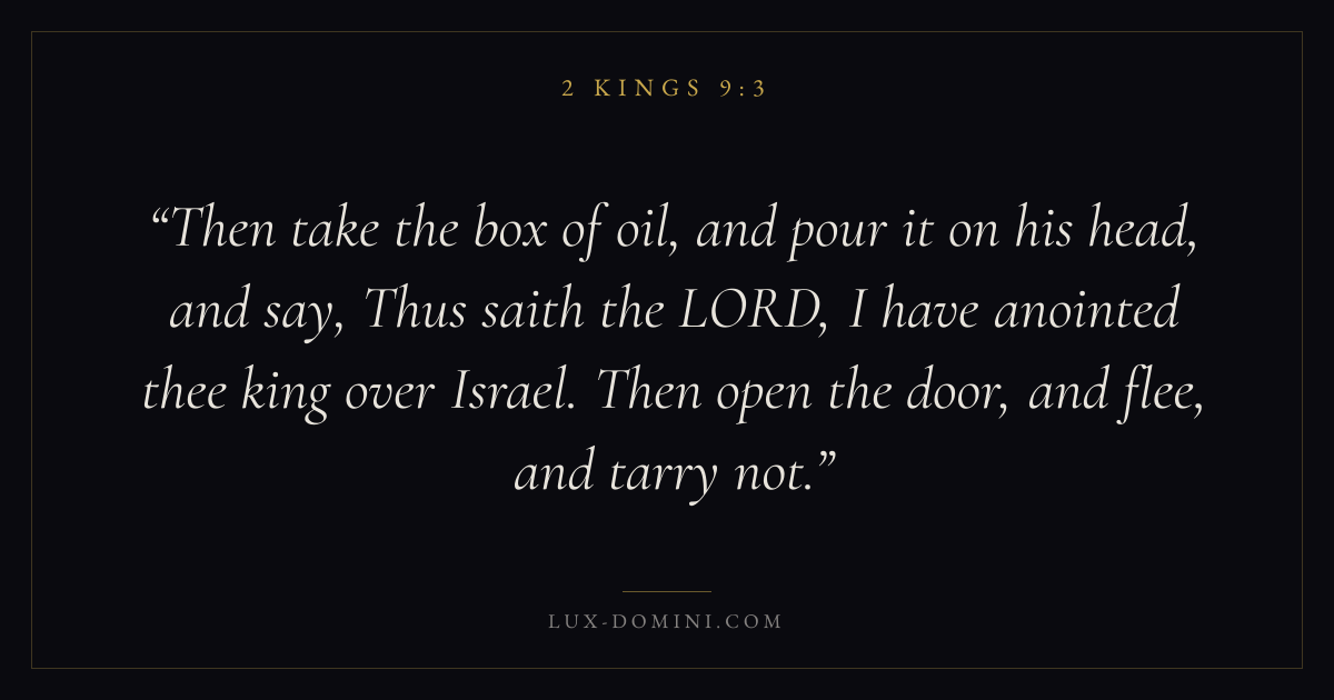 Then take the box of oil, and pour it on his head, and say, Thus saith the LORD, I have anointed thee king over Israel. Then open the door, and flee, and tarry not.