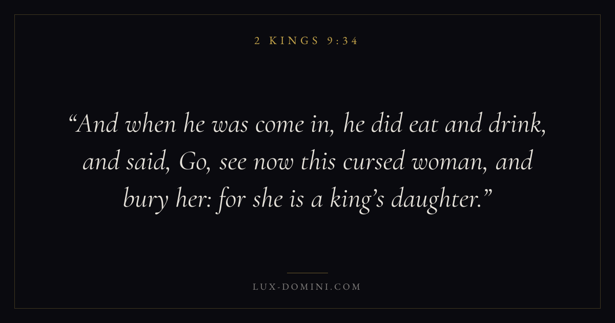 And when he was come in, he did eat and drink, and said, Go, see now this cursed woman, and bury her: for she is a king’s daughter.
