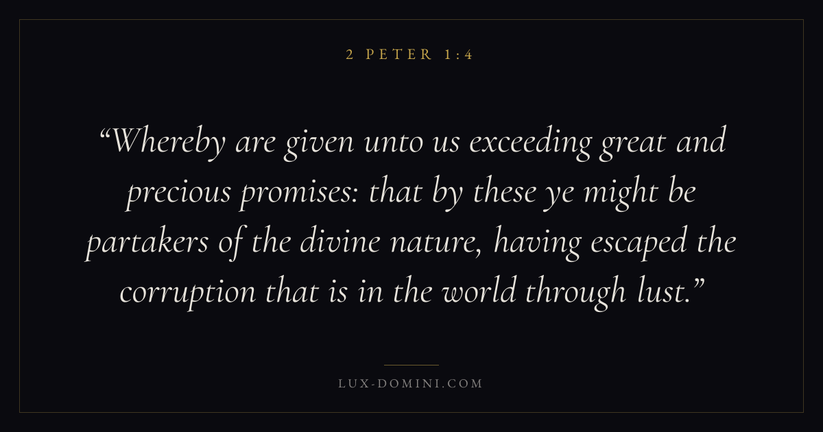 Whereby are given unto us exceeding great and precious promises: that by these ye might be partakers of the divine nature, having escaped the corruption that is in the world through lust.