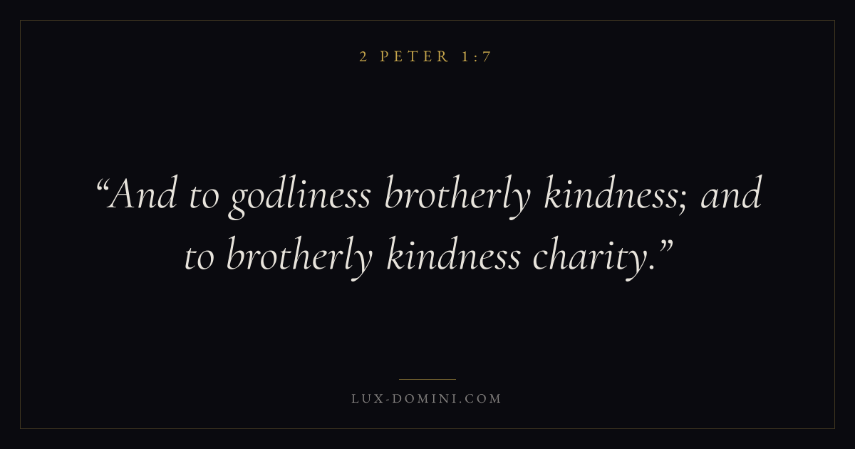 Books / 2 Peter / Chapter 1 / Verse 7 ← 2 Peter 1:6 2 Peter 1:7 2 Peter 1:8 → And to godliness brotherly kindness; and to brotherly kindness charity. Download verse card Share on Twitter Share on Facebook Pin it ✦ Key themes LoveFaithJustice and mercyGraceFalse teaching Read with 2 Peter 1:62 Peter 1:8John 3:161 Corinthians 13:4 Related topics Bible verses about loveBible verses about faithBible verses about justice and mercyBible verses about grace ✦ 2 Peter Chapter 1 verses V. 1 V. 2 V. 3 V. 4 V. 5 V. 6 V. 7 V. 8 V. 9 V. 10 V. 11 V. 12 V. 13 V. 14 V. 15 V. 16 V. 17 V. 18 V. 19 V. 20 V. 21