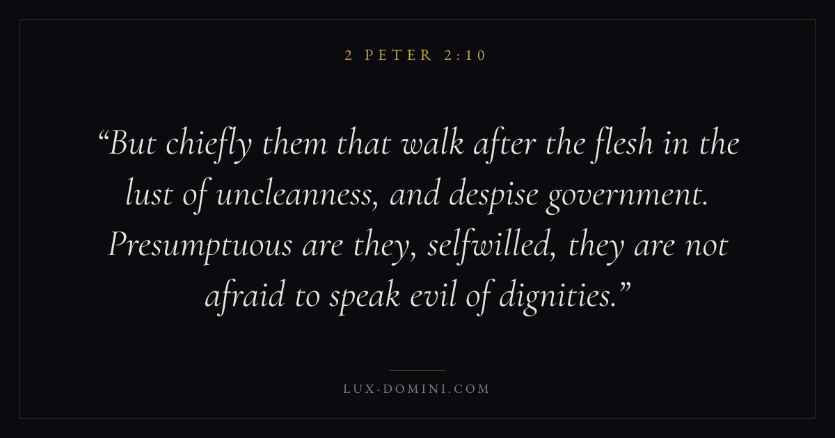 But chiefly them that walk after the flesh in the lust of uncleanness, and despise government. Presumptuous are they, selfwilled, they are not afraid to speak evil of dignities.