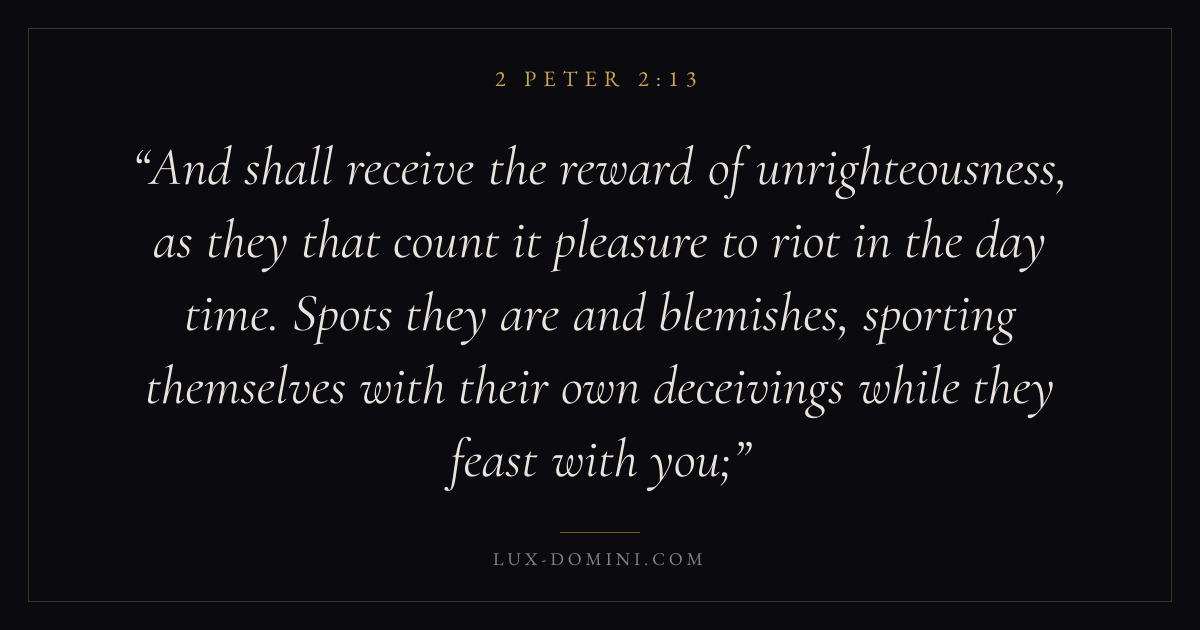 And shall receive the reward of unrighteousness, as they that count it pleasure to riot in the day time. Spots they are and blemishes, sporting themselves with their own deceivings while they feast with you;
