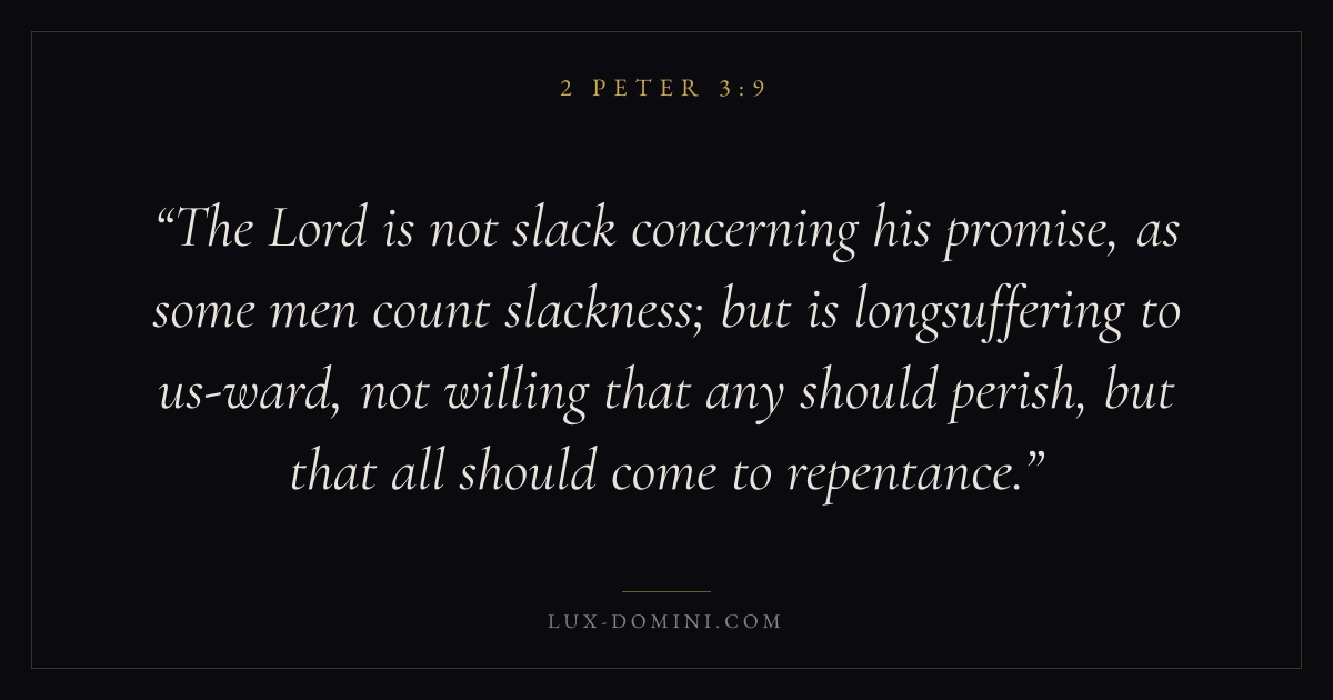 The Lord is not slack concerning his promise, as some men count slackness; but is longsuffering to us-ward, not willing that any should perish, but that all should come to repentance.