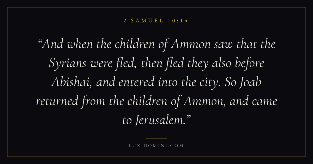 And when the children of Ammon saw that the Syrians were fled, then fled they also before Abishai, and entered into the city. So Joab returned from the children of Ammon, and came to Jerusalem.