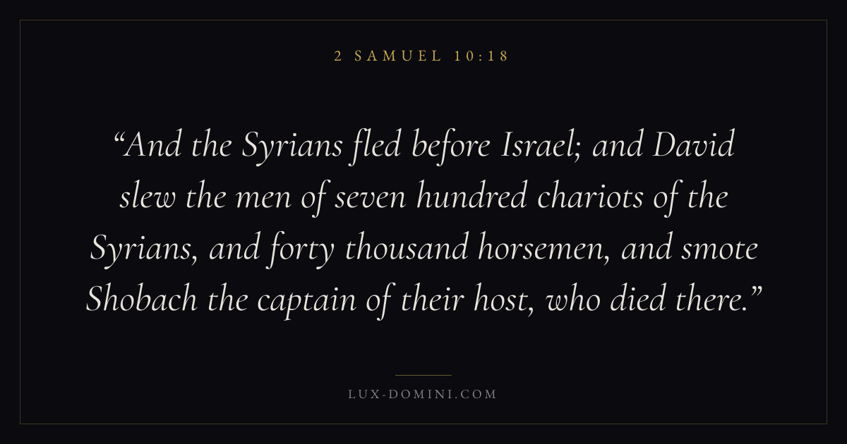 And the Syrians fled before Israel; and David slew the men of seven hundred chariots of the Syrians, and forty thousand horsemen, and smote Shobach the captain of their host, who died there.