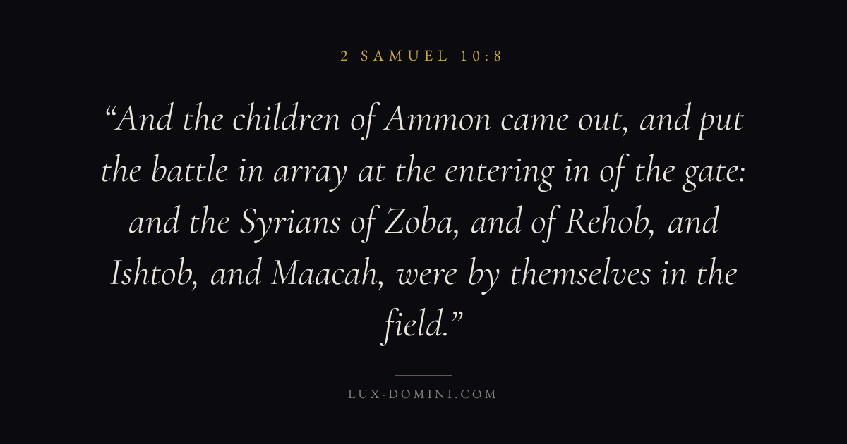 And the children of Ammon came out, and put the battle in array at the entering in of the gate: and the Syrians of Zoba, and of Rehob, and Ishtob, and Maacah, were by themselves in the field.
