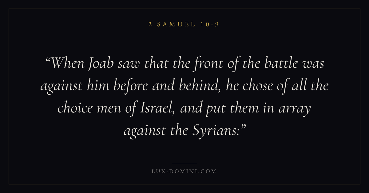 When Joab saw that the front of the battle was against him before and behind, he chose of all the choice men of Israel, and put them in array against the Syrians: