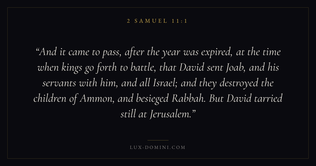 And it came to pass, after the year was expired, at the time when kings go forth to battle, that David sent Joab, and his servants with him, and all Israel; and they destroyed the children of Ammon, and besieged Rabbah. But David tarried still at Jerusalem.