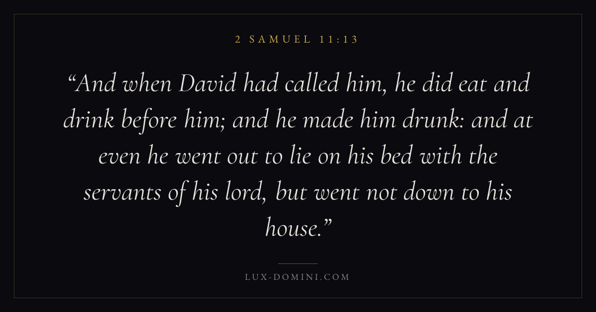 And when David had called him, he did eat and drink before him; and he made him drunk: and at even he went out to lie on his bed with the servants of his lord, but went not down to his house.