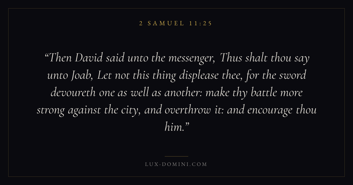Then David said unto the messenger, Thus shalt thou say unto Joab, Let not this thing displease thee, for the sword devoureth one as well as another: make thy battle more strong against the city, and overthrow it: and encourage thou him.