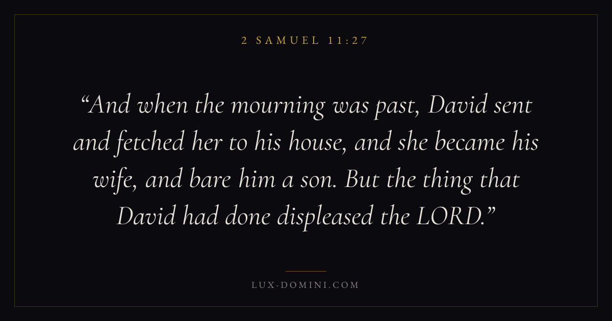 And when the mourning was past, David sent and fetched her to his house, and she became his wife, and bare him a son. But the thing that David had done displeased the LORD.