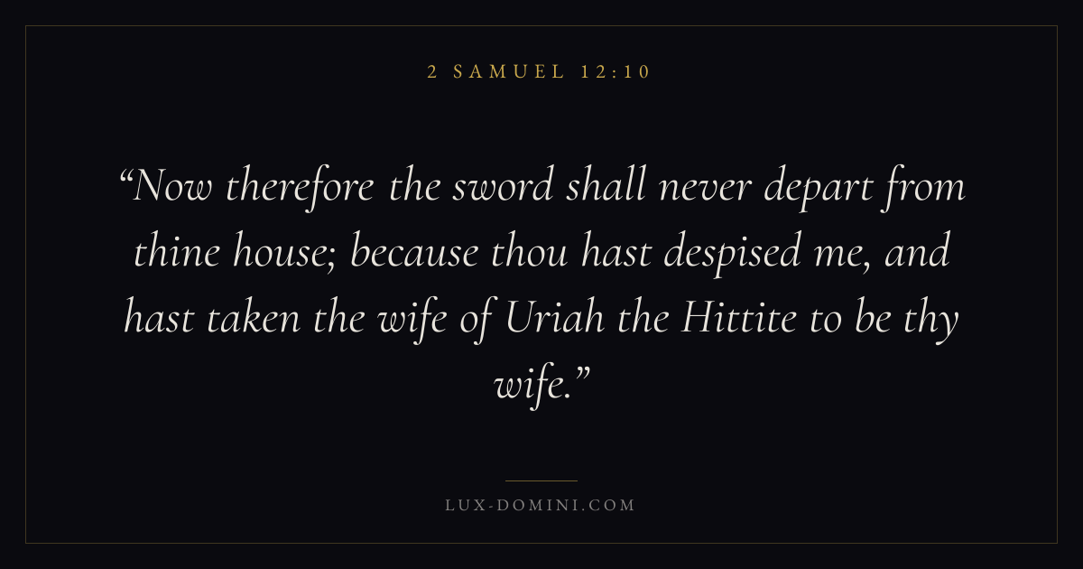 Now therefore the sword shall never depart from thine house; because thou hast despised me, and hast taken the wife of Uriah the Hittite to be thy wife.