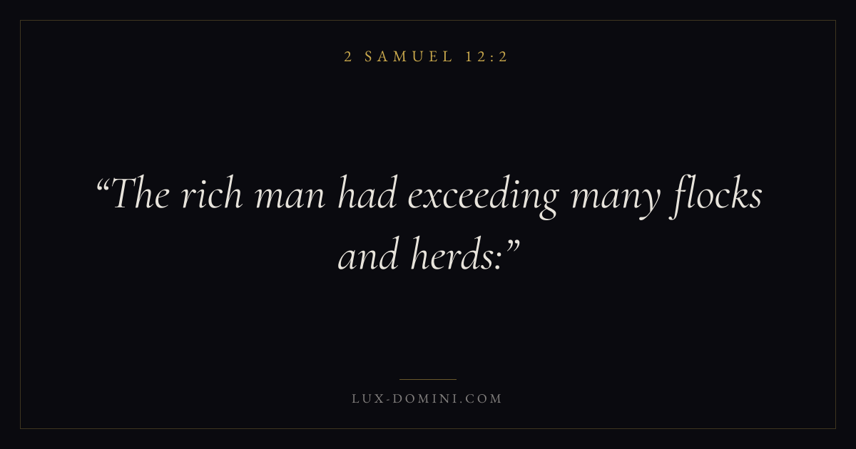 Books / 2 Samuel / Chapter 12 / Verse 2 ← 2 Samuel 12:1 2 Samuel 12:2 2 Samuel 12:3 → The rich man had exceeding many flocks and herds: Download verse card Share on Twitter Share on Facebook Pin it ✦ Key themes Suffering and trialsJustice and mercyPeaceDavidic covenant Read with 2 Samuel 12:32 Samuel 12:4Romans 8:182 Corinthians 4:17 Related topics Bible verses about suffering and trialsBible verses about justice and mercyBible verses about peace ✦ 2 Samuel Chapter 12 verses V. 1 V. 2 V. 3 V. 4 V. 5 V. 6 V. 7 V. 8 V. 9 V. 10 V. 11 V. 12 V. 13 V. 14 V. 15 V. 16 V. 17 V. 18 V. 19 V. 20 V. 21 V. 22 V. 23 V. 24 V. 25 V. 26 V. 27 V. 28 V. 29 V. 30 V. 31