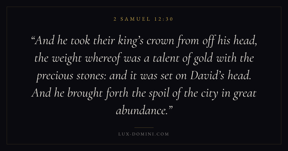 And he took their king’s crown from off his head, the weight whereof was a talent of gold with the precious stones: and it was set on David’s head. And he brought forth the spoil of the city in great abundance.