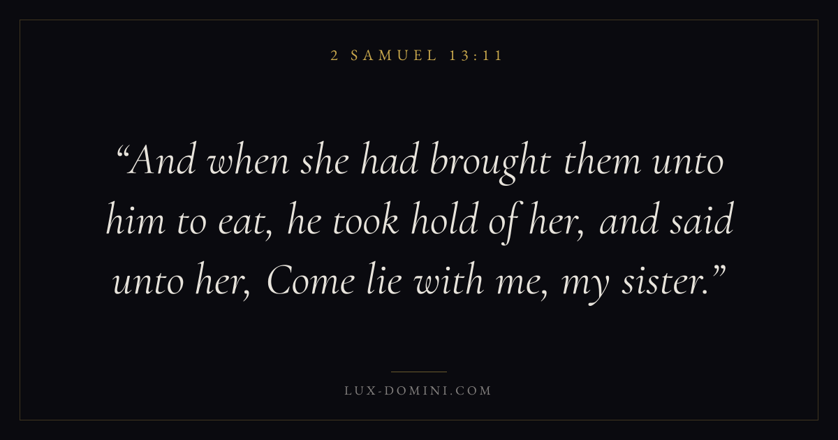 And when she had brought them unto him to eat, he took hold of her, and said unto her, Come lie with me, my sister.
