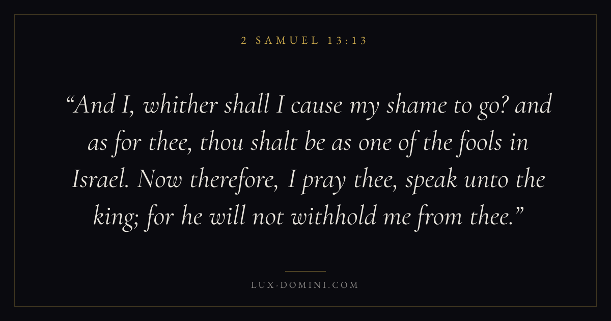 And I, whither shall I cause my shame to go? and as for thee, thou shalt be as one of the fools in Israel. Now therefore, I pray thee, speak unto the king; for he will not withhold me from thee.