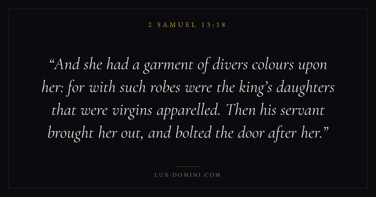 And she had a garment of divers colours upon her: for with such robes were the king’s daughters that were virgins apparelled. Then his servant brought her out, and bolted the door after her.