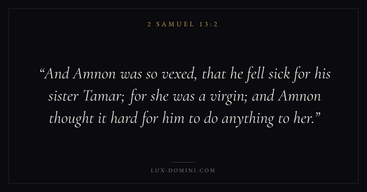 And Amnon was so vexed, that he fell sick for his sister Tamar; for she was a virgin; and Amnon thought it hard for him to do anything to her.