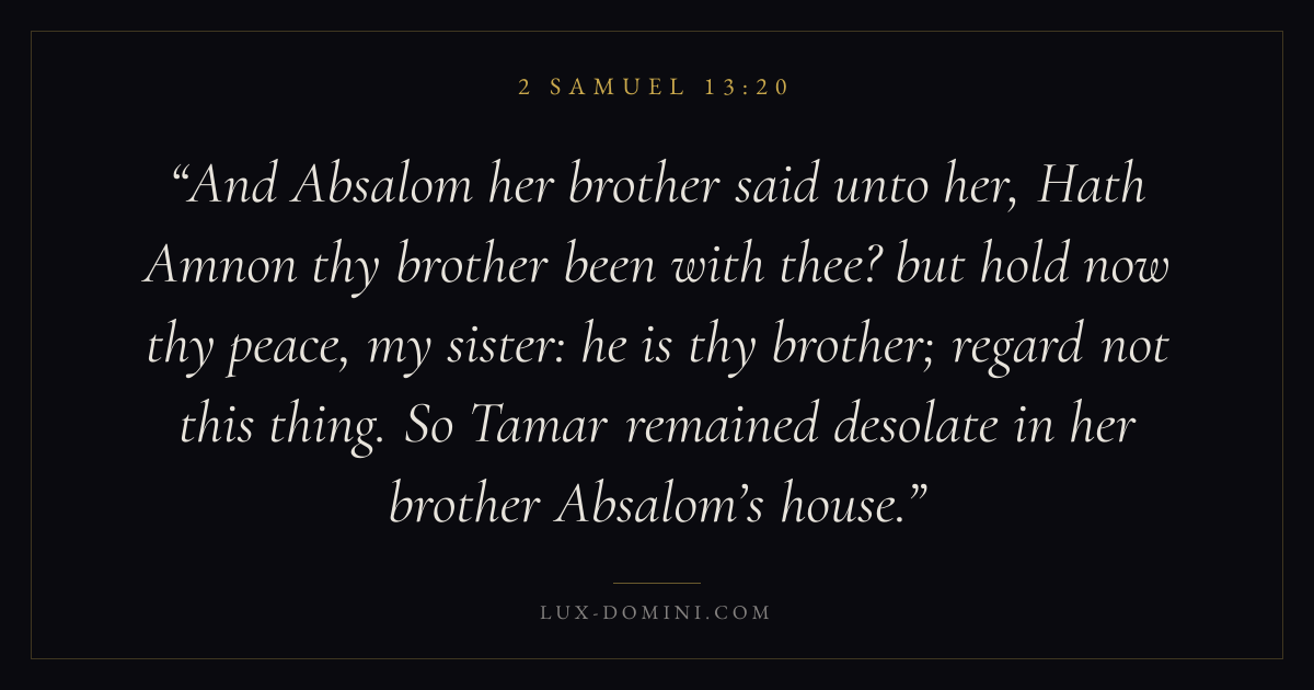 And Absalom her brother said unto her, Hath Amnon thy brother been with thee? but hold now thy peace, my sister: he is thy brother; regard not this thing. So Tamar remained desolate in her brother Absalom’s house.