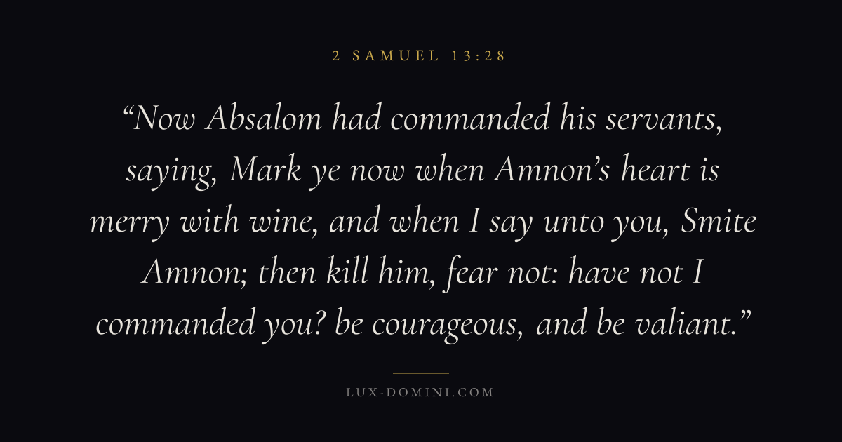 Now Absalom had commanded his servants, saying, Mark ye now when Amnon’s heart is merry with wine, and when I say unto you, Smite Amnon; then kill him, fear not: have not I commanded you? be courageous, and be valiant.