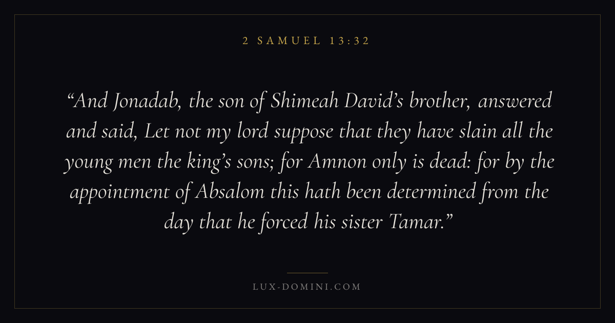 And Jonadab, the son of Shimeah David’s brother, answered and said, Let not my lord suppose that they have slain all the young men the king’s sons; for Amnon only is dead: for by the appointment of Absalom this hath been determined from the day that he forced his sister Tamar.