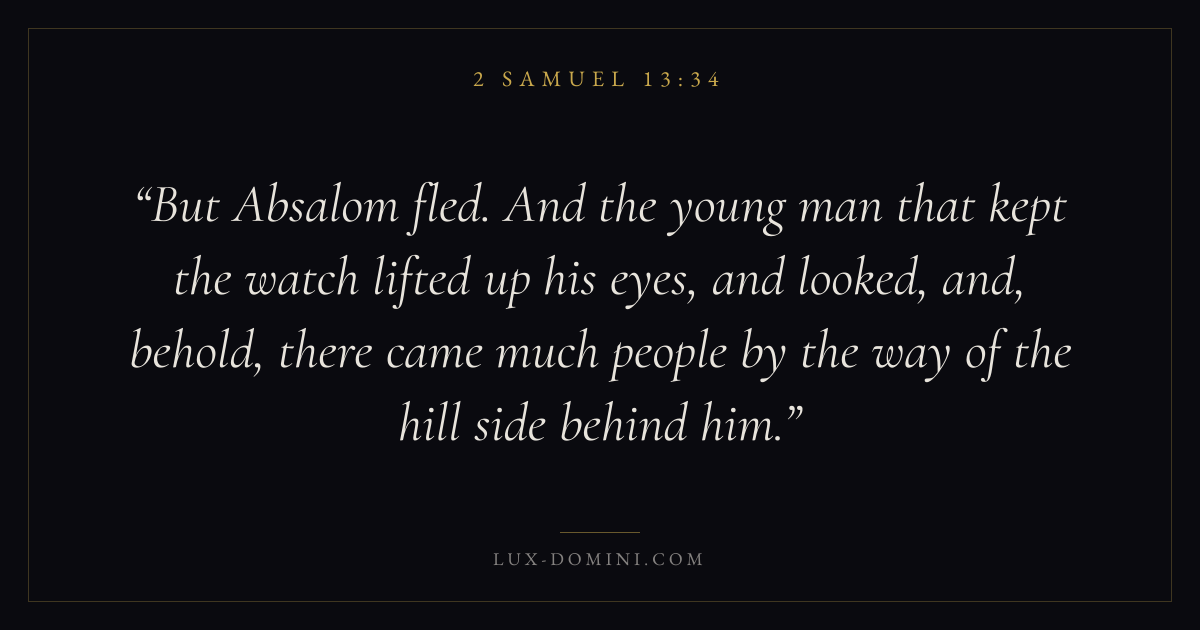 But Absalom fled. And the young man that kept the watch lifted up his eyes, and looked, and, behold, there came much people by the way of the hill side behind him.