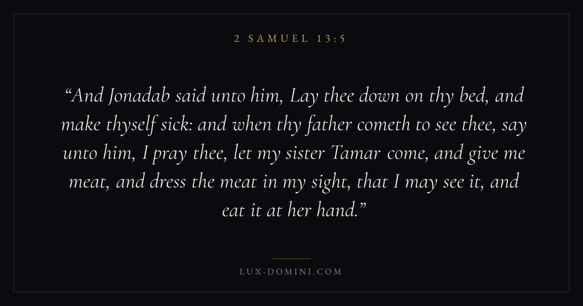 And Jonadab said unto him, Lay thee down on thy bed, and make thyself sick: and when thy father cometh to see thee, say unto him, I pray thee, let my sister Tamar come, and give me meat, and dress the meat in my sight, that I may see it, and eat it at her hand.