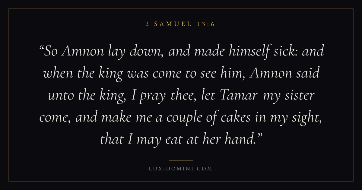 So Amnon lay down, and made himself sick: and when the king was come to see him, Amnon said unto the king, I pray thee, let Tamar my sister come, and make me a couple of cakes in my sight, that I may eat at her hand.
