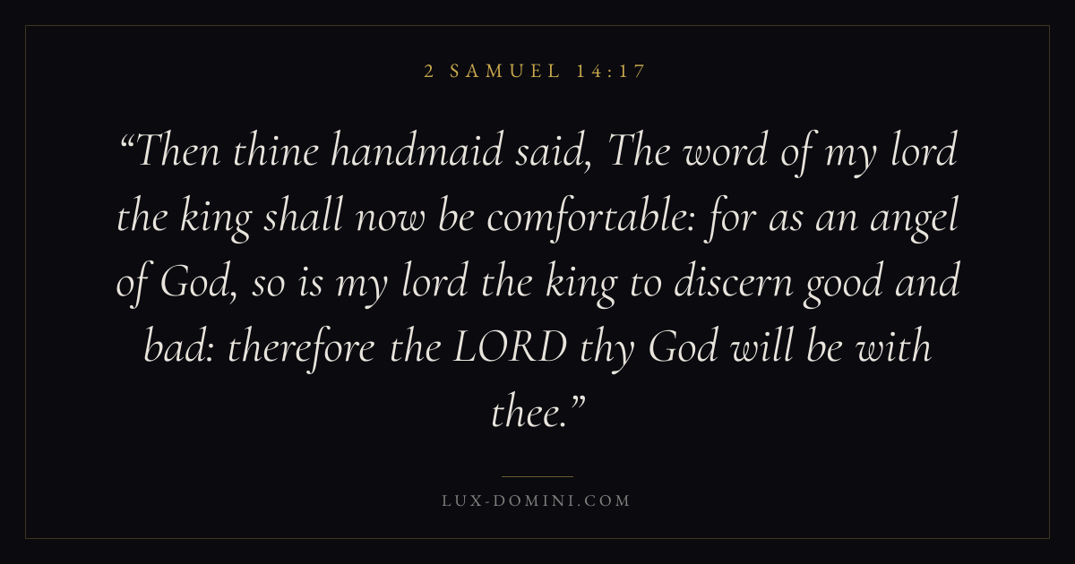 Then thine handmaid said, The word of my lord the king shall now be comfortable: for as an angel of God, so is my lord the king to discern good and bad: therefore the LORD thy God will be with thee.