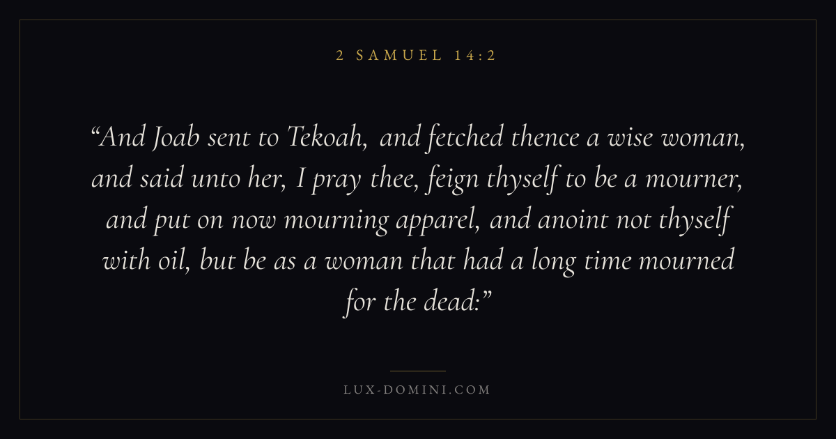 And Joab sent to Tekoah, and fetched thence a wise woman, and said unto her, I pray thee, feign thyself to be a mourner, and put on now mourning apparel, and anoint not thyself with oil, but be as a woman that had a long time mourned for the dead: