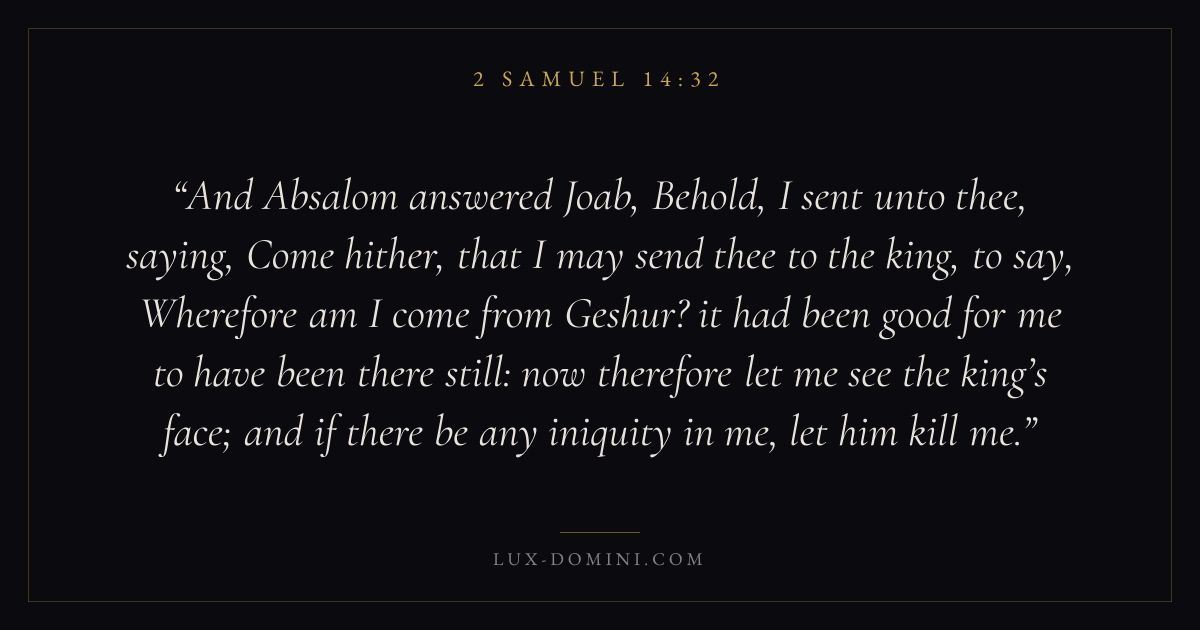 And Absalom answered Joab, Behold, I sent unto thee, saying, Come hither, that I may send thee to the king, to say, Wherefore am I come from Geshur? it had been good for me to have been there still: now therefore let me see the king’s face; and if there be any iniquity in me, let him kill me.