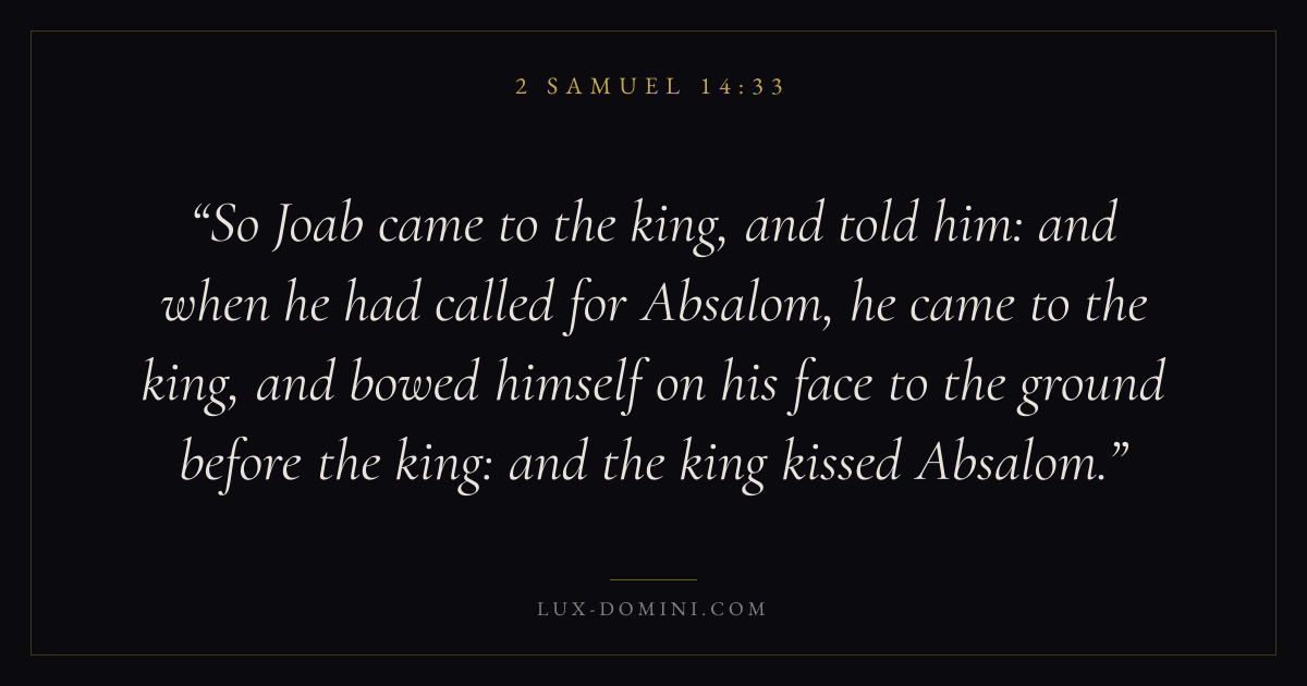 So Joab came to the king, and told him: and when he had called for Absalom, he came to the king, and bowed himself on his face to the ground before the king: and the king kissed Absalom.